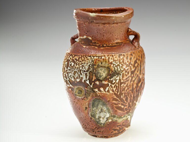 Image: Chester Nealie, Red Shino Vase, 2002, wood-fired stoneware with shino slip, fired in the firebox of Chester’s multi-chamber kiln at Goanna Ridge, Gulgong.